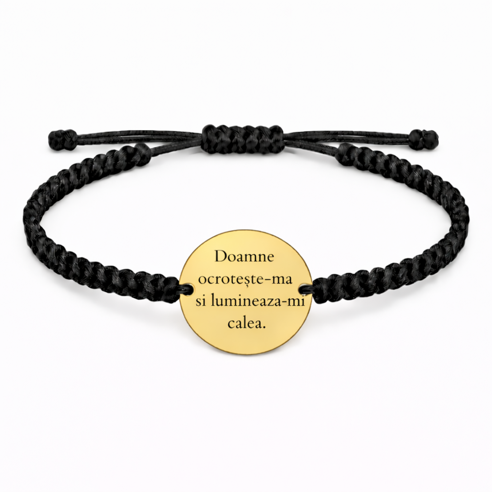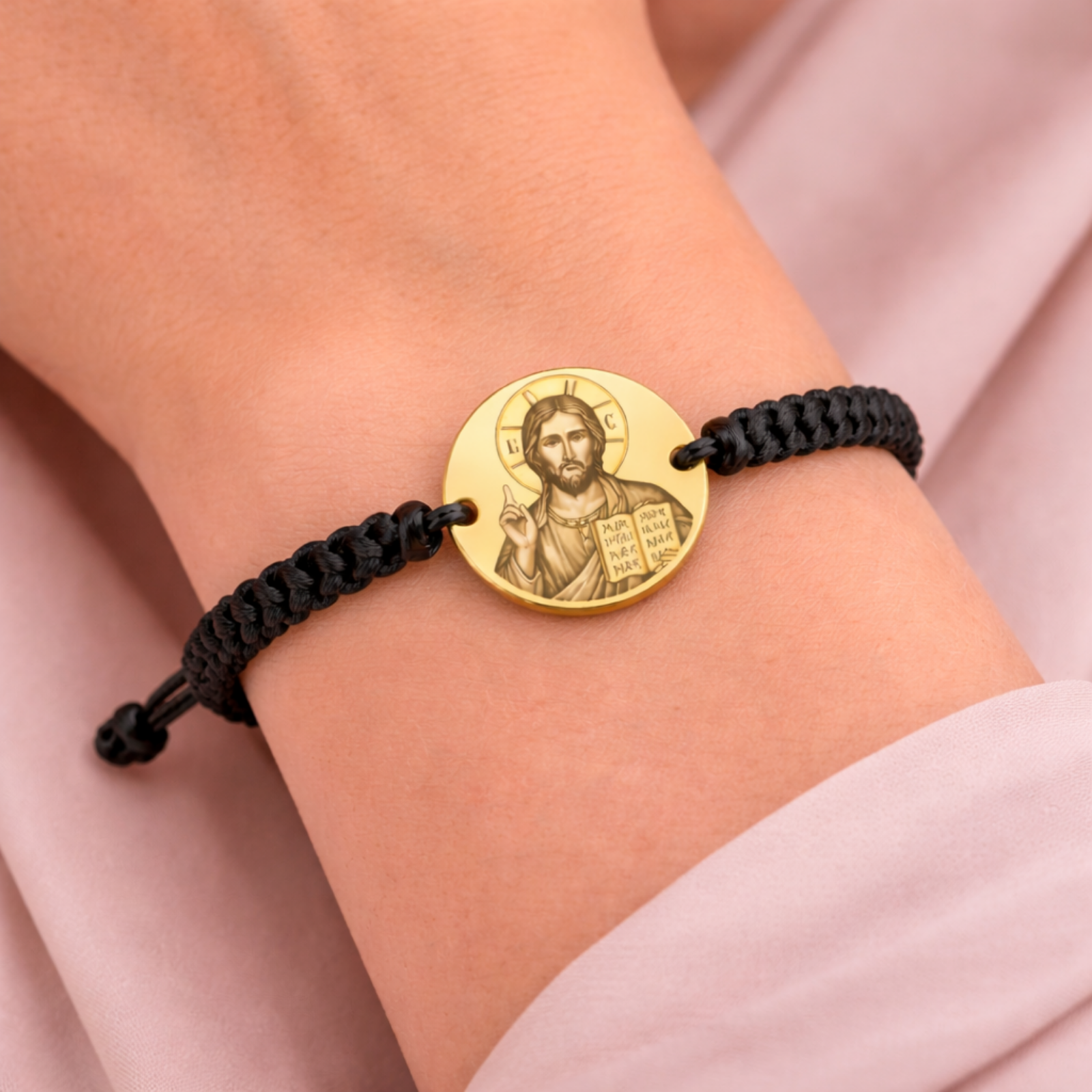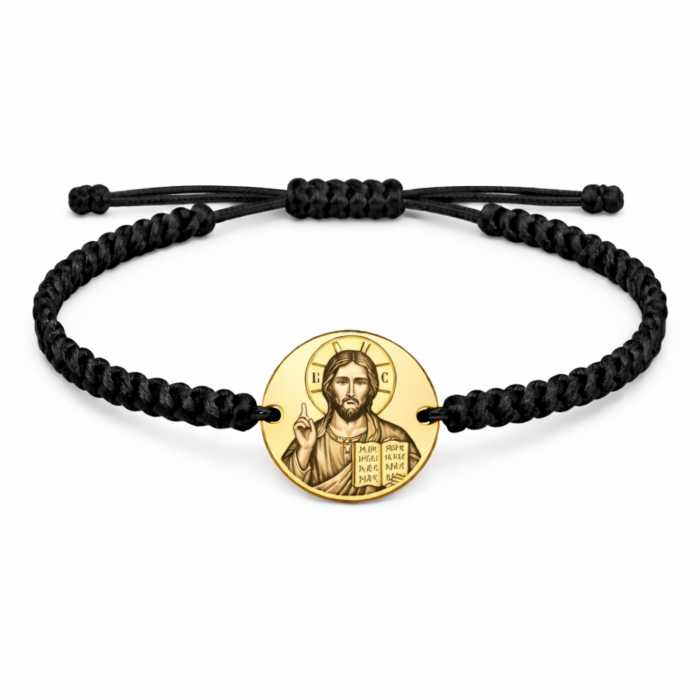 O brățară cu semnificație profundă, realizată cu bănuț din inox auriu și șnur împletit, gravată cu icoana Mântuitorului. Un accesoriu care îmbină eleganța cu credința și poate fi purtat zilnic ca simbol spiritual.