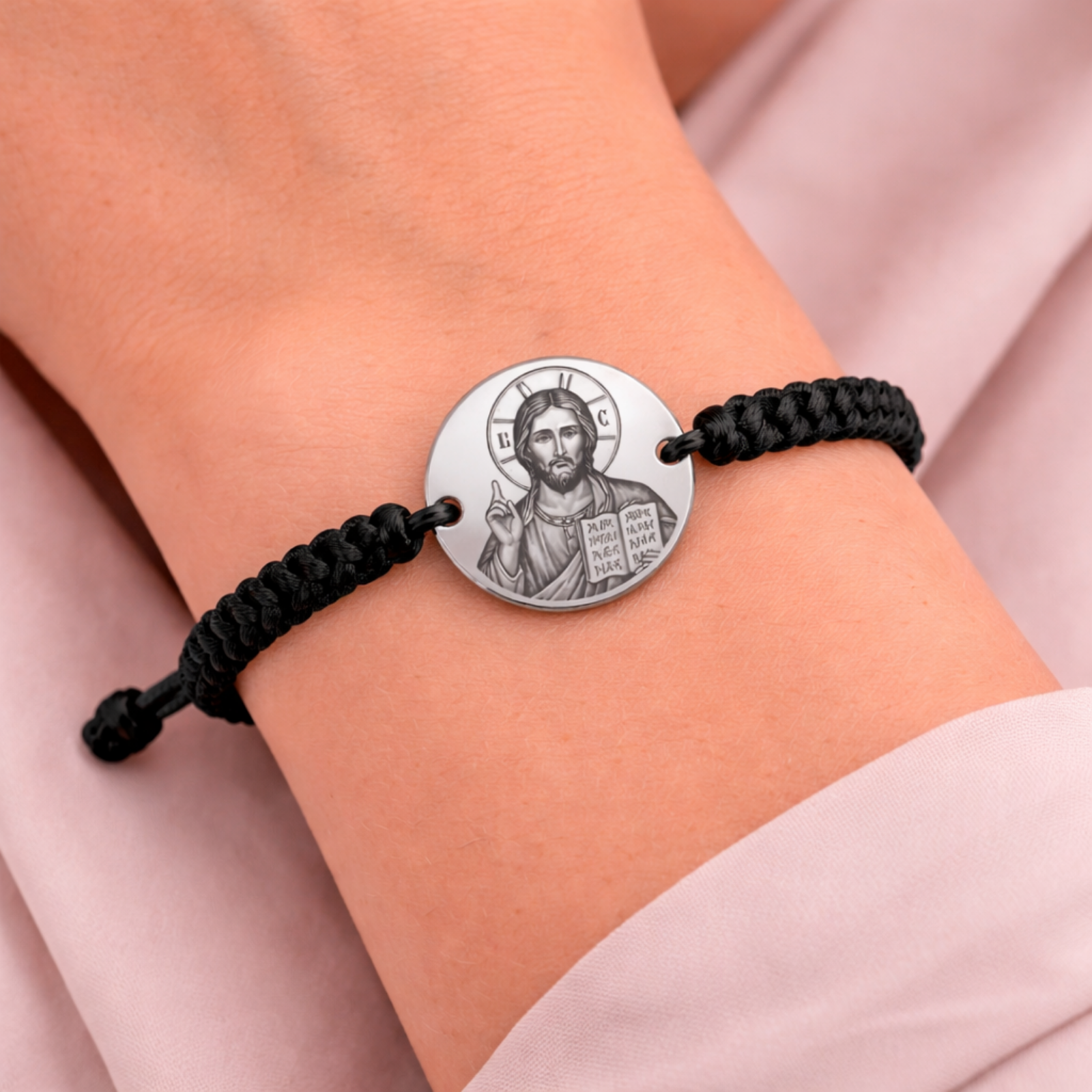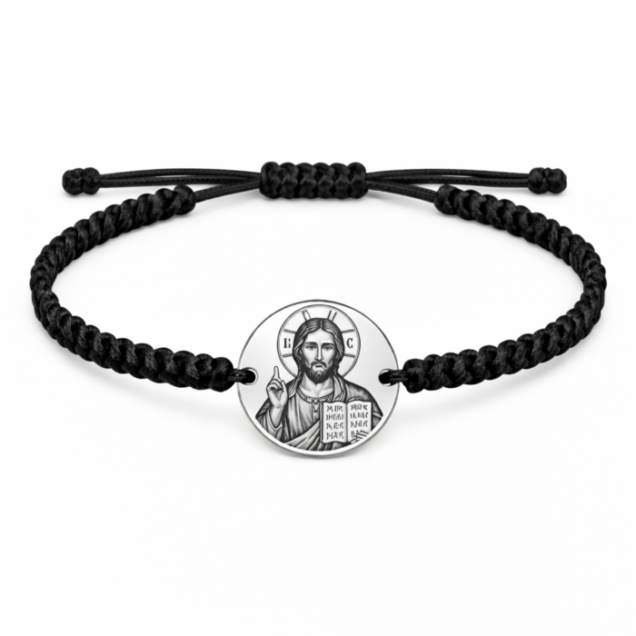 O brățară cu semnificație profundă, realizată cu bănuț din inox argintiu și șnur împletit, gravată cu icoana Mântuitorului. Un accesoriu care este o expresie a credinței și protecției spirituale.