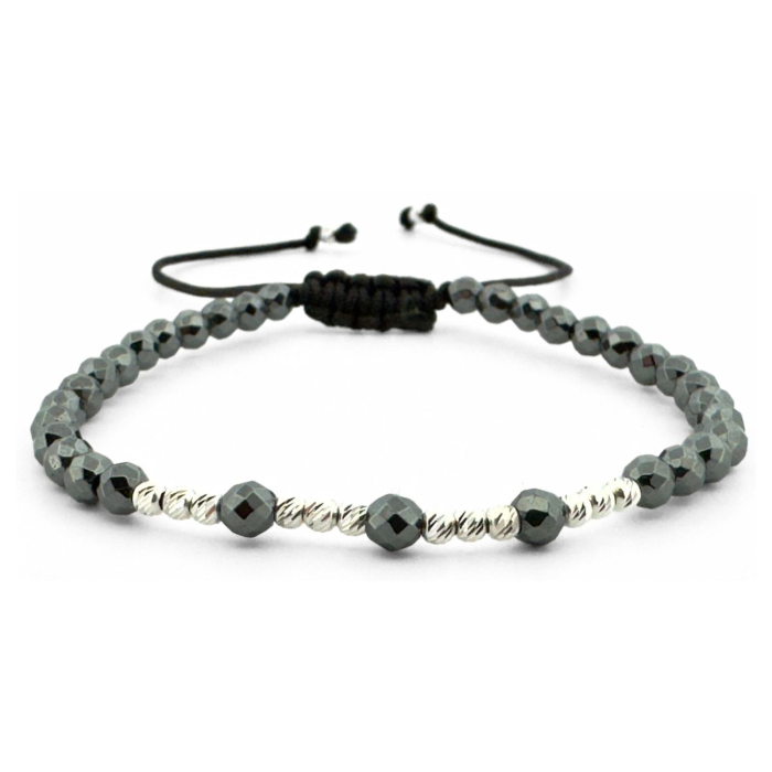 Realizată manual în atelierul Teo Bijoux din România, această brățară îmbină strălucirea discretă a hematitului fațetat cu finețea argintului 925, rezultând o bijuterie creată pentru delicatețe și echilibru.