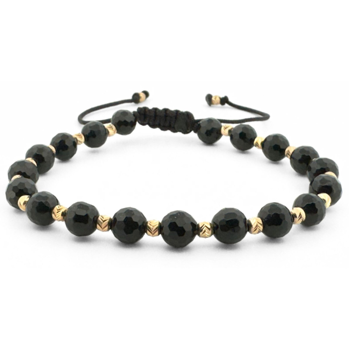 Brățară unisex realizată manual cu onix lucios fațetat de 6 mm și biluțe de argint placate cu aur de 3 mm, cu șnur reglabil și design elegant, potrivită pentru orice stil și ocazie.