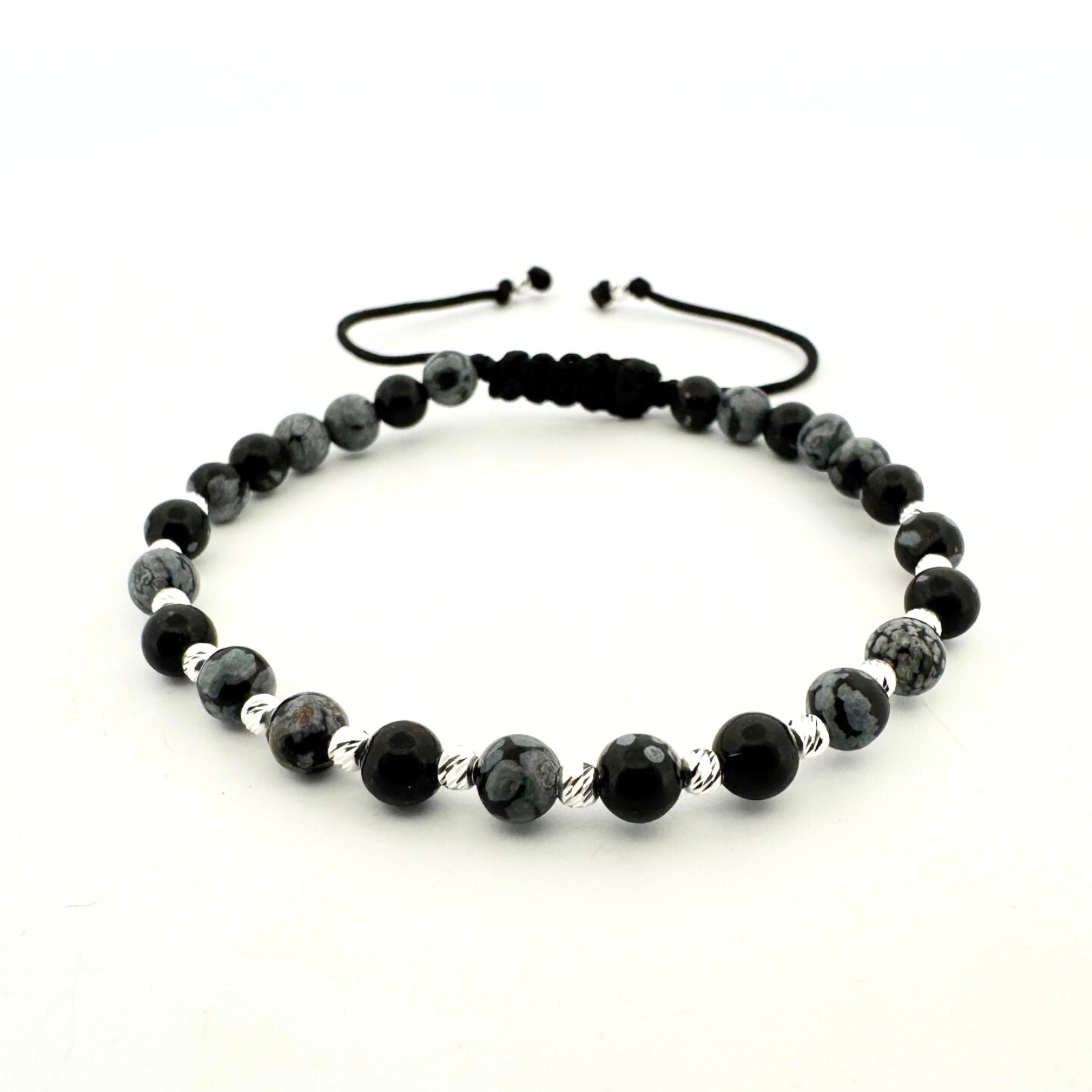 Cele 16 biluțe din argint 925 sunt așezate armonios între pietrele naturale, formând un design care transmite echilibru și naturalețe. Brățara este asamblată cu grijă în atelier, astfel încât argintul și pietrele semipretioase de obsidian să formeze un design echilibrat si expresiv, șnurul reglabil conferă brățării versatilitate și aceasta se va așeza perfect pe orice încheietură.