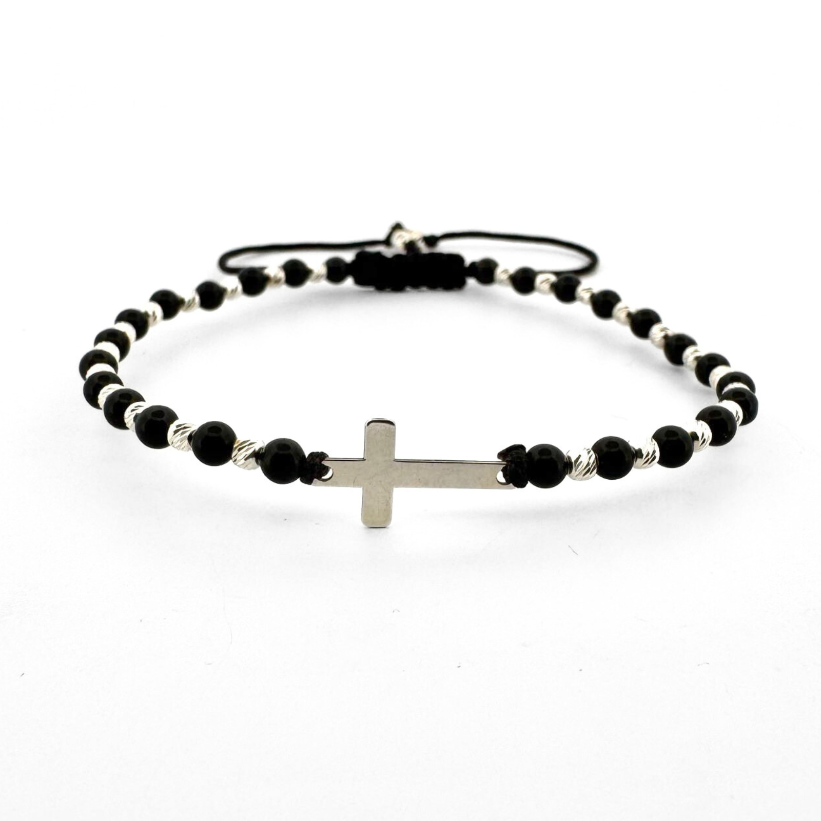 Brățară spirituală din argint 925 cu 26 biluțe de 2.5 mm, cruciuliță de 1.5 cm și pietre naturale de onix negru lucios 3 mm – simbol al credinței și echilibrului interior.