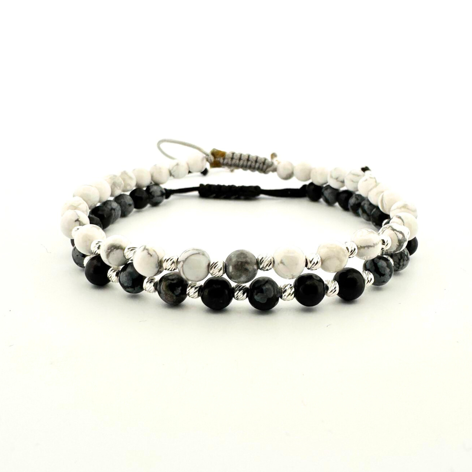 Set format din două brățări cu Howlit și Obsidian Fulg de Nea, fiecare completată cu 16 biluțe din argint 925 și șnur reglabil. Un duo elegant, natural și plin de semnificație.